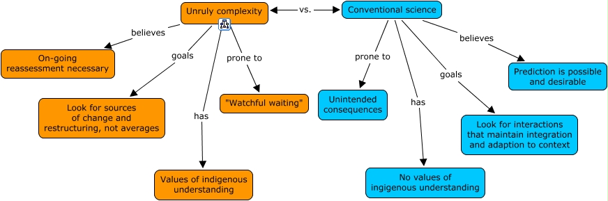 unruly complexity, Conventional science has No values of ingigenous understanding, Unruly complexity prone to "Watchful waiting", Unruly complexity goals Look for sources of change and restructuring, not averages, Conventional science believes Prediction is possible and desirable, Conventional science prone to Unintended consequences, Conventional science goals Look for interactions that maintain integration and adaption to context, Unruly complexity believes On-going reassessment necessary, Unruly complexity has Values of indigenous understanding