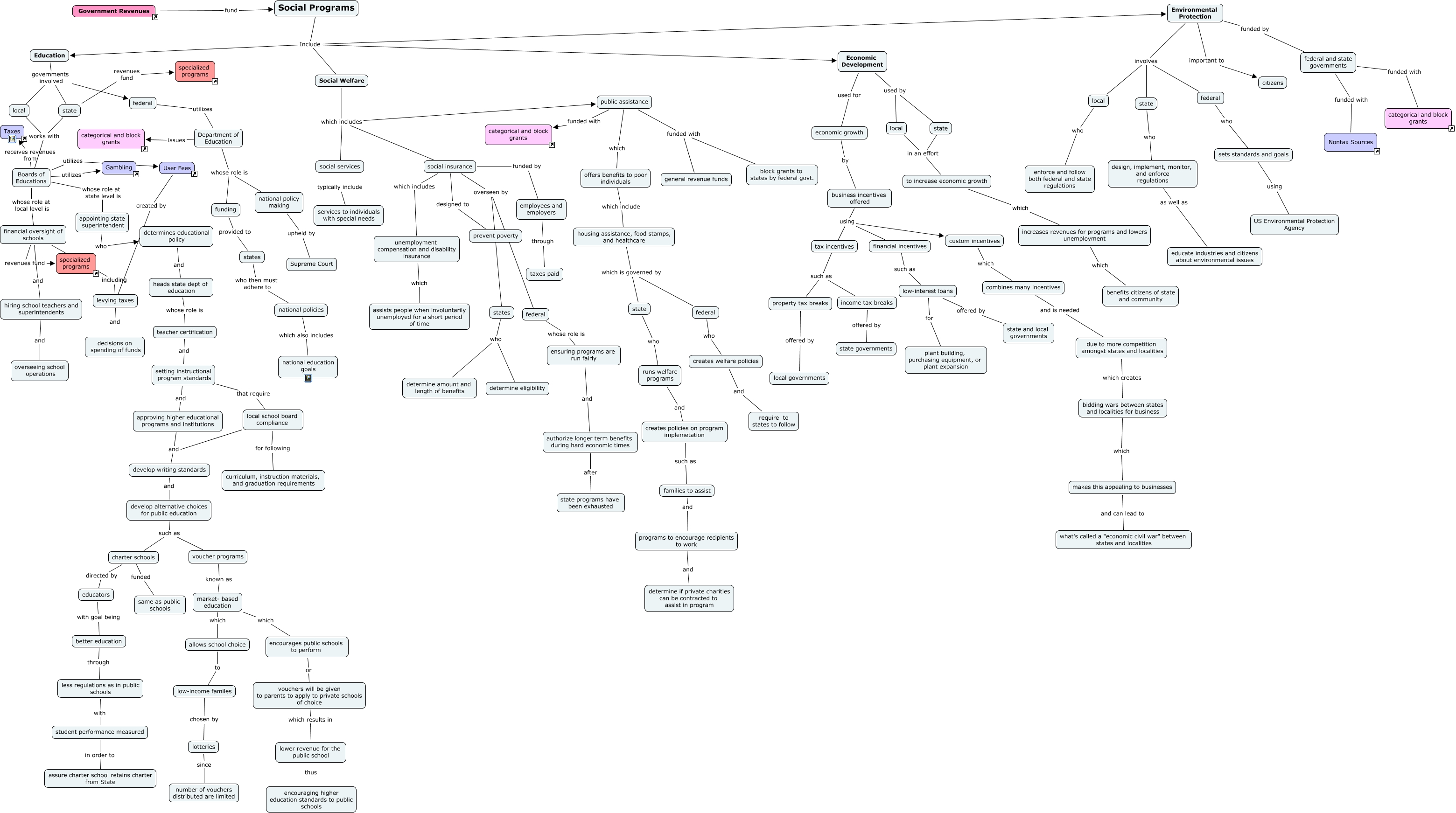 This Concept Map has information related to: Social Programs, Government Revenues fund Social Programs, social insurance overseen by federal, Education governments involved local, determines educational policy and heads state dept of education, creates welfare policies and require to states to follow, programs to encourage recipients to work and determine if private charities can be contracted to assist in program, Social Programs Include Education, Boards of Educations receives revenues from Taxes, allows school choice to low-income familes, setting instructional program standards that require local school board compliance