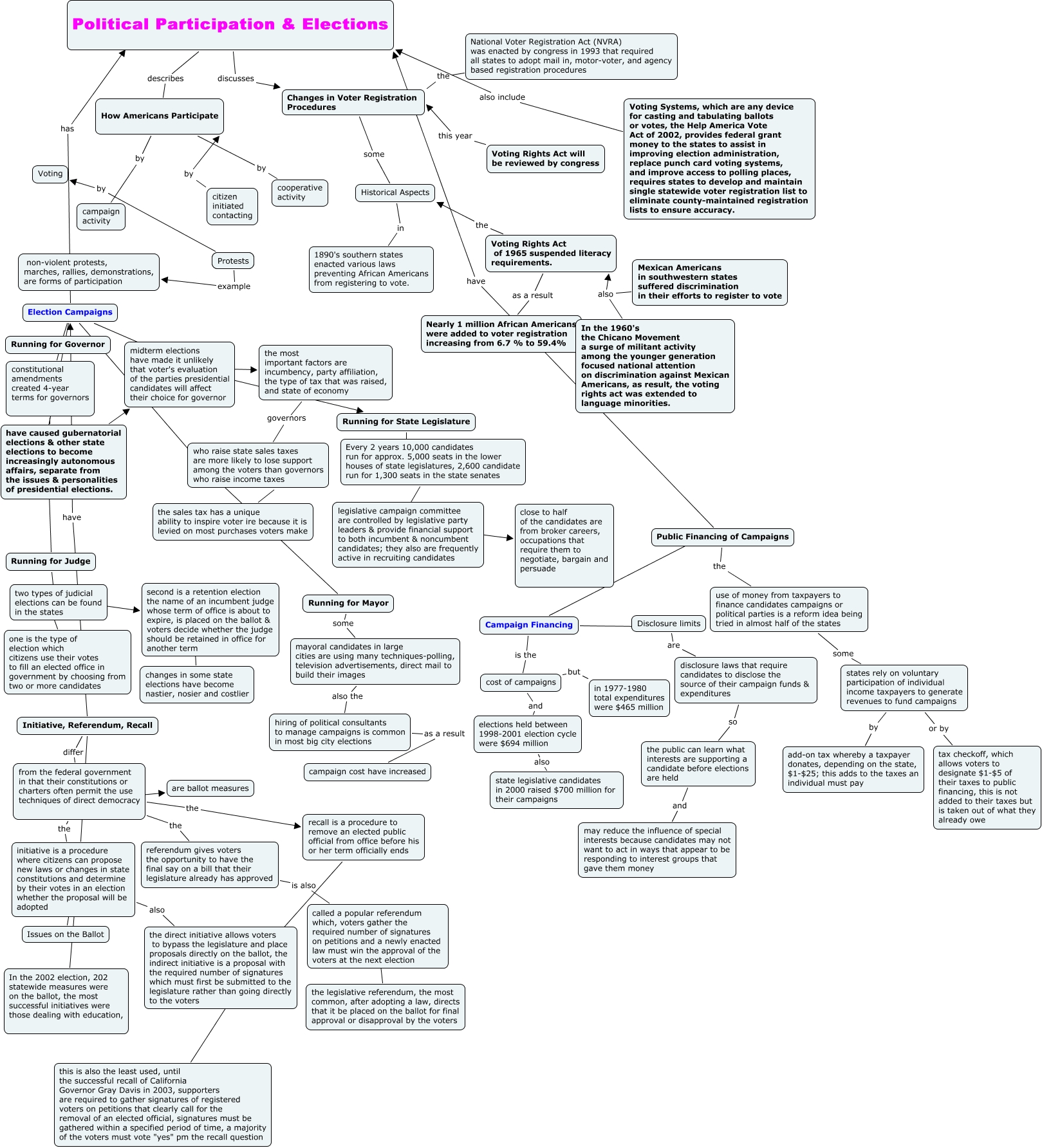 This Concept Map has information related to: Poliltical Participation & Elections, Protests example non-violent protests, marches, rallies, demonstrations, are forms of participation, Election Campaigns running for governor constitutional amendments created 4-year terms for governors, cost of campaigns and elections held between 1998-2001 election cycle were $694 million, have caused gubernatorial elections & other state elections to become increasingly autonomous affairs, separate from the issues & personalities of presidential elections. ???? midterm elections have made it unlikely that voter's evaluation of the parties presidential candidates will affect their choice for governor, How Americans Participate by cooperative activity, legislative campaign committee are controlled by legislative party leaders & provide financial support to both incumbent & noncumbent candidates; they also are frequently active in recruiting candidates ???? close to half of the candidates are from broker careers, occupations that require them to negotiate, bargain and persuade, two types of judicial elections can be found in the states ???? second is a retention election the name of an incumbent judge whose term of office is about to expire, is placed on the ballot & voters decide whether the judge should be retained in office for another term, Initiative, Referendum, Recall have Election Campaigns, Voting Systems, which are any device for casting and tabulating ballots or votes, the Help America Vote Act of 2002, provides federal grant money to the states to assist in improving election administration, replace punch card voting systems, and improve access to polling places, requires states to develop and maintain single statewide voter registration list to eliminate county-maintained registration lists to ensure accuracy. also include Political Participation & Elections, Campaign Financing is the cost of campaigns
