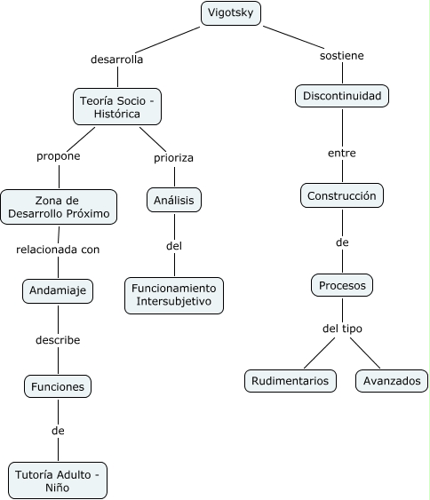 vigotsky, Discontinuidad entre Construcción, Vigotsky sostiene Discontinuidad, Procesos del tipo Avanzados, Construcción de Procesos, Vigotsky desarrolla Teoría Socio - Histórica, Teoría Socio - Histórica propone Zona de Desarrollo Próximo, Procesos del tipo Rudimentarios, Análisis del Funcionamiento Intersubjetivo, Funciones de Tutoría Adulto - Niño, Teoría Socio - Histórica prioriza Análisis