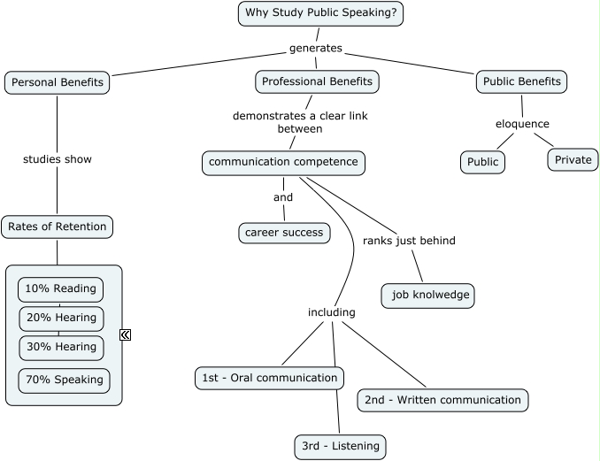 This Concept Map has information related to: Public Speaking, Public Benefits eloquence Public, Why Study Public Speaking? generates Public Benefits, Why Study Public Speaking? generates Personal Benefits, Personal Benefits studies show Rates of Retention, communication competence ranks just behind job knolwedge, communication competence including 1st - Oral communication, Rates of Retention ???? 10% Reading, communication competence including 2nd - Written communication, communication competence and career success, Why Study Public Speaking? generates Professional Benefits