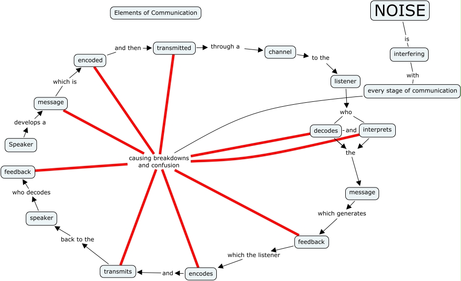 This Concept Map has information related to: Elements of Communication, NOISE is interfering, every stage of communication causing breakdowns and confusion encoded, every stage of communication causing breakdowns and confusion feedback, decodes the message, Speaker develops a message, channel to the listener, feedback which the listener encodes, message which generates feedback, every stage of communication causing breakdowns and confusion transmits, interfering with every stage of communication