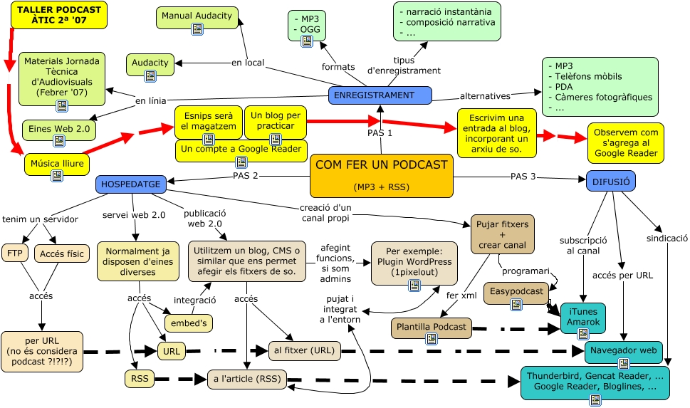 Aquest mapa conceptual conté informació relacionada amb: podcasting, URL al fitxer (URL), Utilitzem un blog, CMS o similar que ens permet afegir els fitxers de so. accés a l'article (RSS), ENREGISTRAMENT en local Audacity, embed's integració Utilitzem un blog, CMS o similar que ens permet afegir els fitxers de so., FTP accés per URL (no és considera podcast ?!?!?), Pujar fitxers + crear canal fer xml Plantilla Podcast, a l'article (RSS) pujat i integrat a l'entorn Per exemple: Plugin WordPress (1pixelout), DIFUSIÓ sindicació Thunderbird, Gencat Reader, ... Google Reader, Bloglines, ..., ENREGISTRAMENT formats - MP3 - OGG, COM FER UN PODCAST (MP3 + RSS) PAS 2 HOSPEDATGE, RSS a l'article (RSS), a l'article (RSS) Thunderbird, Gencat Reader, ... Google Reader, Bloglines, ..., DIFUSIÓ subscripció al canal iTunes Amarok, Música lliure Esnips serà el magatzem, ENREGISTRAMENT en línia Materials Jornada Tècnica d'Audiovisuals (Febrer '07), HOSPEDATGE creació d'un canal propi Pujar fitxers + crear canal, ENREGISTRAMENT en línia Eines Web 2.0, Un blog per practicar Escrivim una entrada al blog, incorporant un arxiu de so., Plantilla Podcast iTunes Amarok, Normalment ja disposen d'eines diverses accés embed's