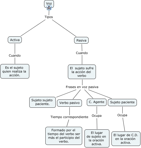 Este mapa conceptual tiene información relacionada a: Voz, El sujeto sufre la acción del verbo Frases en voz pasiva Verbo pasivo, Pasiva Cuando El sujeto sufre la acción del verbo, C. Agente Ocupa El lugar de sujeto en la oración activa., Verbo pasivo Tiempo correspondiente Formado por el tiempo del verbo ser más el participio del verbo., El sujeto sufre la acción del verbo Frases en voz pasiva Sujeto:sujeto paciente., El sujeto sufre la acción del verbo Frases en voz pasiva Sujeto paciente, Voz Tipos Pasiva, Activa Cuando Es el sujeto quien realiza la acción., El sujeto sufre la acción del verbo Frases en voz pasiva C. Agente, Sujeto paciente Ocupa El lugar de C.D. en la oración activa.