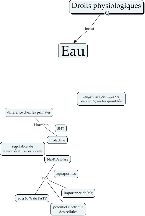 This Concept Map has information related to: Eau, Na-K ATPase ???? importance de Mg, Droits physiologiques inclut Eau, Prolactine ???? régulation de la température corporelle, Na-K ATPase ???? potentiel électrique des cellules, Na-K ATPase ???? 30 à 60 % de l'ATP, différence chez les primates Horrobin Prolactine