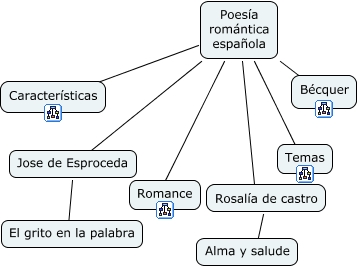 Este mapa conceptual tiene información relacionada a: POESIA ROMANTICA ESPAÑOLA, Poesía romántica española ???? Temas, Poesía romántica española ???? Jose de Esproceda, Jose de Esproceda ???? El grito en la palabra, Rosalía de castro ???? Alma y salude, Poesía romántica española ???? Romance, Poesía romántica española ???? Bécquer, Poesía romántica española ???? Características, Poesía romántica española ???? Rosalía de castro