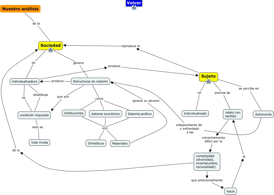 nuestro analisis, Instituciones son Simbólicos, Autonomía independiente de y enfrentado a las Estructuras de relación, Estructuras de relación que son condición impuesta, Estructuras de relación como sistema económico, Sociedad es individualizadora, individualizadora produce Sujeto, sistema económico son Materiales, relato con sentido crecientemente difícil por la complejidad (diversidad, incertidumbre, racionalidad), complejidad (diversidad, incertidumbre, racionalidad) que emocionalmente Vacía, Sujeto es Individualizado