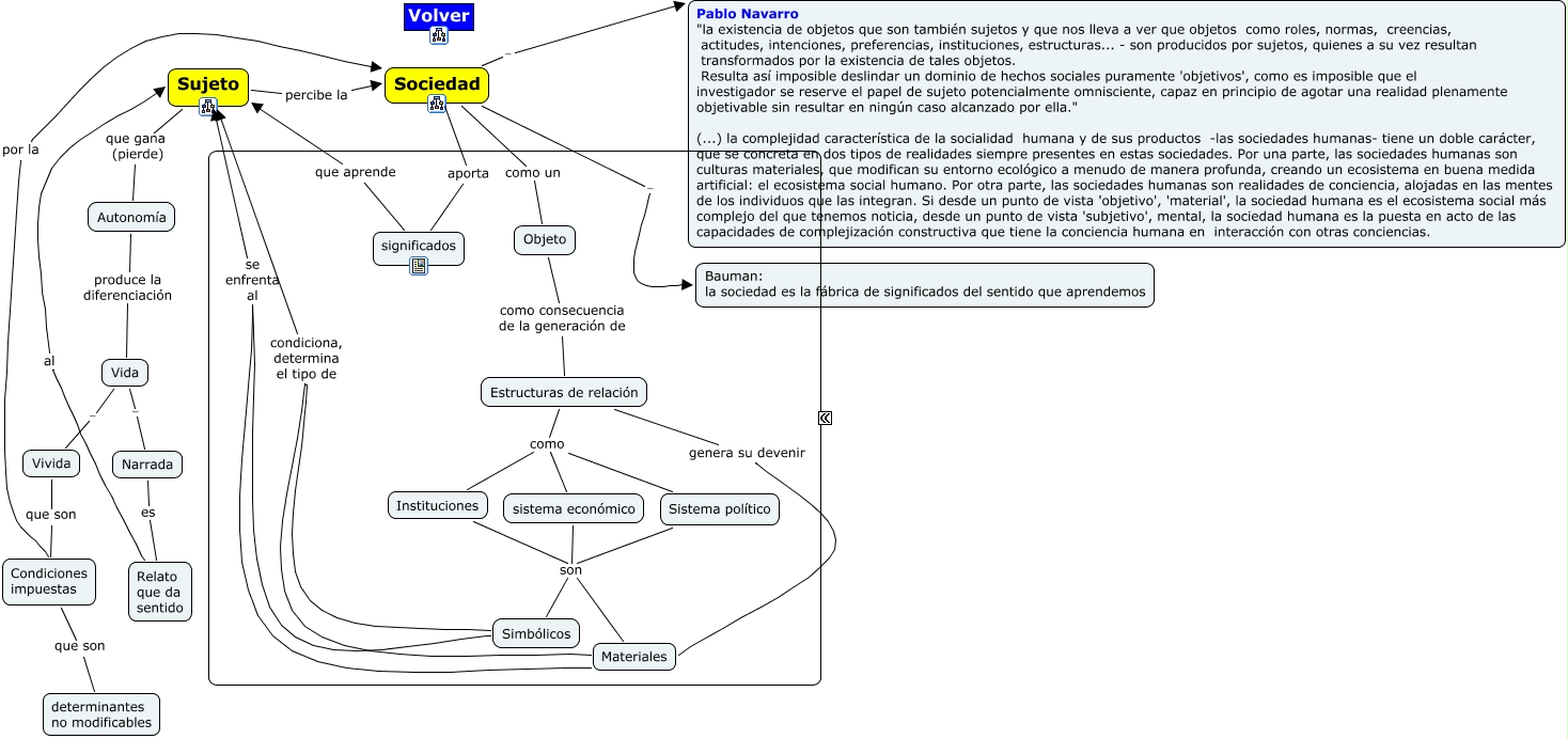 Sujeto sociedad objeto, Vivida que son Condiciones impuestas, Simbólicos condiciona, determina el tipo de Sujeto, Vida - Narrada, sistema económico son Materiales, Vida - Vivida, Sociedad aporta significados, Simbólicos se enfrenta al Sujeto, Objeto como consecuencia de la generación de Estructuras de relación, Autonomía produce la diferenciación Vida, Sujeto que gana (pierde) Autonomía