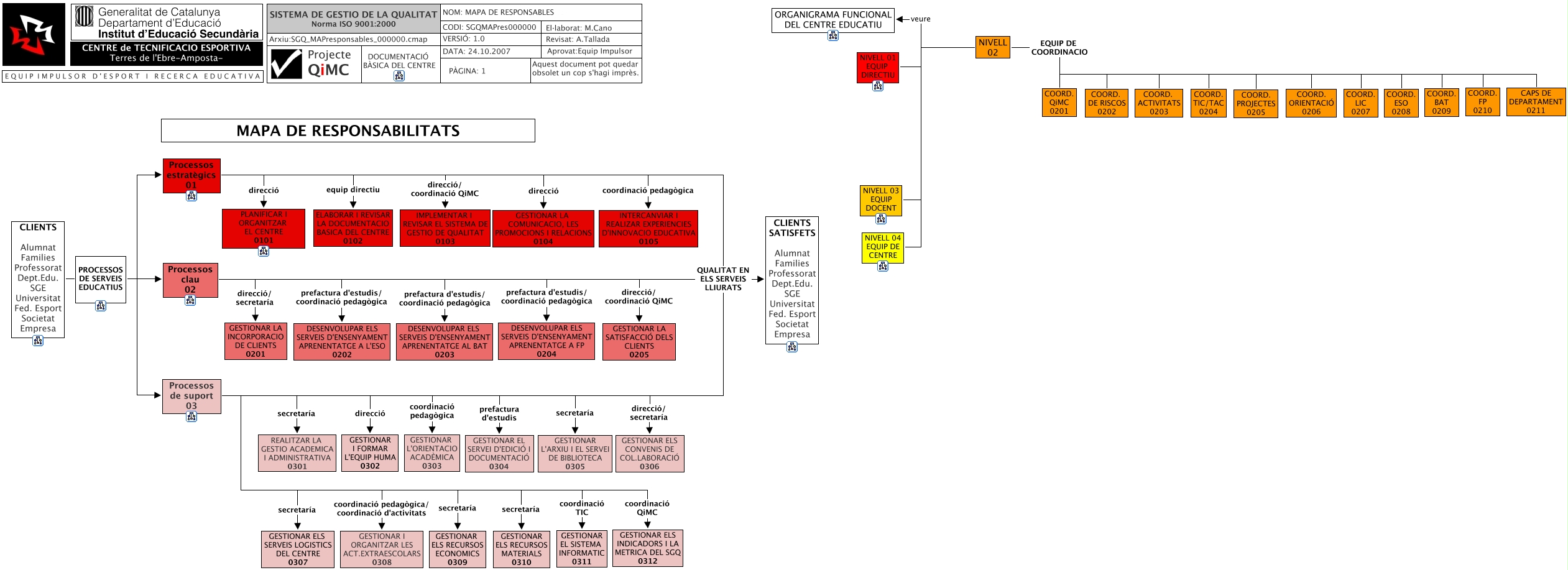This Concept Map has information related to: SGQ_MAPresponsables_020000, Processos clau 02 direcció/ coordinació QiMC GESTIONAR LA SATISFACCIÓ DELS CLIENTS 0205, Processos de suport 03 secretaría GESTIONAR ELS SERVEIS LOGISTICS DEL CENTRE 0307, Processos de suport 03 coordinació pedagògica GESTIONAR L'ORIENTACIO ACADÈMICA 0303, Processos de suport 03 direcció/ secretaría GESTIONAR ELS CONVENIS DE COL.LABORACIÓ 0306, NIVELL 02 EQUIP DE COORDINACIO COORD. ACTIVITATS 0203, CLIENTS Alumnat Families Professorat Dept.Edu. SGE Universitat Fed. Esport Societat Empresa PROCESSOS DE SERVEIS EDUCATIUS Processos estratègics 01, Processos de suport 03 coordinació QiMC GESTIONAR ELS INDICADORS I LA METRICA DEL SGQ 0312, CLIENTS Alumnat Families Professorat Dept.Edu. SGE Universitat Fed. Esport Societat Empresa PROCESSOS DE SERVEIS EDUCATIUS Processos clau 02, NIVELL 02 EQUIP DE COORDINACIO COORD. PROJECTES 0205, Processos estratègics 01 direcció PLANIFICAR I ORGANITZAR EL CENTRE 0101