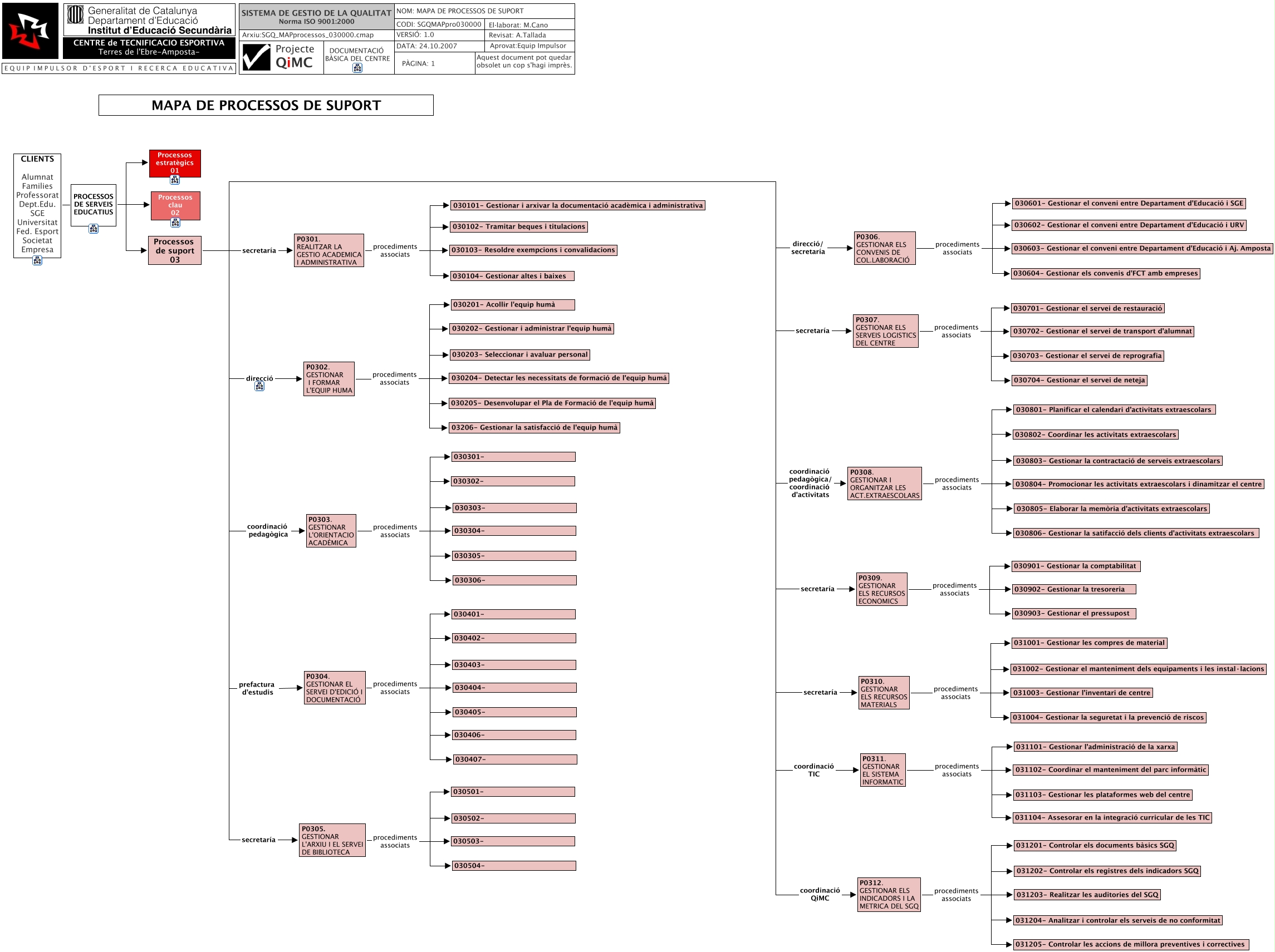 This Concept Map has information related to: SGQ_MAPprocessos_030000, P0310. GESTIONAR ELS RECURSOS MATERIALS procediments associats 031001- Gestionar les compres de material, P0312. GESTIONAR ELS INDICADORS I LA METRICA DEL SGQ procediments associats 031202- Controlar els registres dels indicadors SGQ, P0311. GESTIONAR EL SISTEMA INFORMATIC procediments associats 031102- Coordinar el manteniment del parc informàtic, P0308. GESTIONAR I ORGANITZAR LES ACT.EXTRAESCOLARS procediments associats 030805- Elaborar la memòria d'activitats extraescolars, P0304. GESTIONAR EL SERVEI D'EDICIÓ I DOCUMENTACIÓ procediments associats 030404-, P0306. GESTIONAR ELS CONVENIS DE COL.LABORACIÓ procediments associats 030603- Gestionar el conveni entre Departament d'Educació i Aj. Amposta, P0302. GESTIONAR I FORMAR L'EQUIP HUMA procediments associats 030204- Detectar les necessitats de formació de l'equip humà, P0308. GESTIONAR I ORGANITZAR LES ACT.EXTRAESCOLARS procediments associats 030803- Gestionar la contractació de serveis extraescolars, Processos de suport 03 prefactura d'estudis P0304. GESTIONAR EL SERVEI D'EDICIÓ I DOCUMENTACIÓ, P0302. GESTIONAR I FORMAR L'EQUIP HUMA procediments associats 030203- Seleccionar i avaluar personal