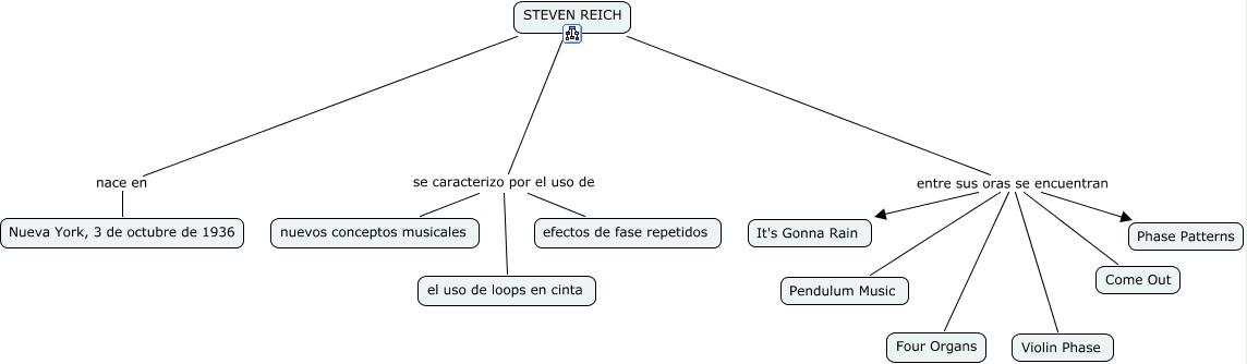 Este mapa conceptual tiene información relacionada a: STEVEN REICH, STEVEN REICH entre sus oras se encuentran Violin Phase, STEVEN REICH se caracterizo por el uso de efectos de fase repetidos, STEVEN REICH se caracterizo por el uso de nuevos conceptos musicales, STEVEN REICH entre sus oras se encuentran Four Organs, STEVEN REICH se caracterizo por el uso de el uso de loops en cinta, STEVEN REICH entre sus oras se encuentran Pendulum Music, STEVEN REICH entre sus oras se encuentran Come Out, STEVEN REICH entre sus oras se encuentran Phase Patterns, STEVEN REICH nace en Nueva York, 3 de octubre de 1936, STEVEN REICH entre sus oras se encuentran It's Gonna Rain