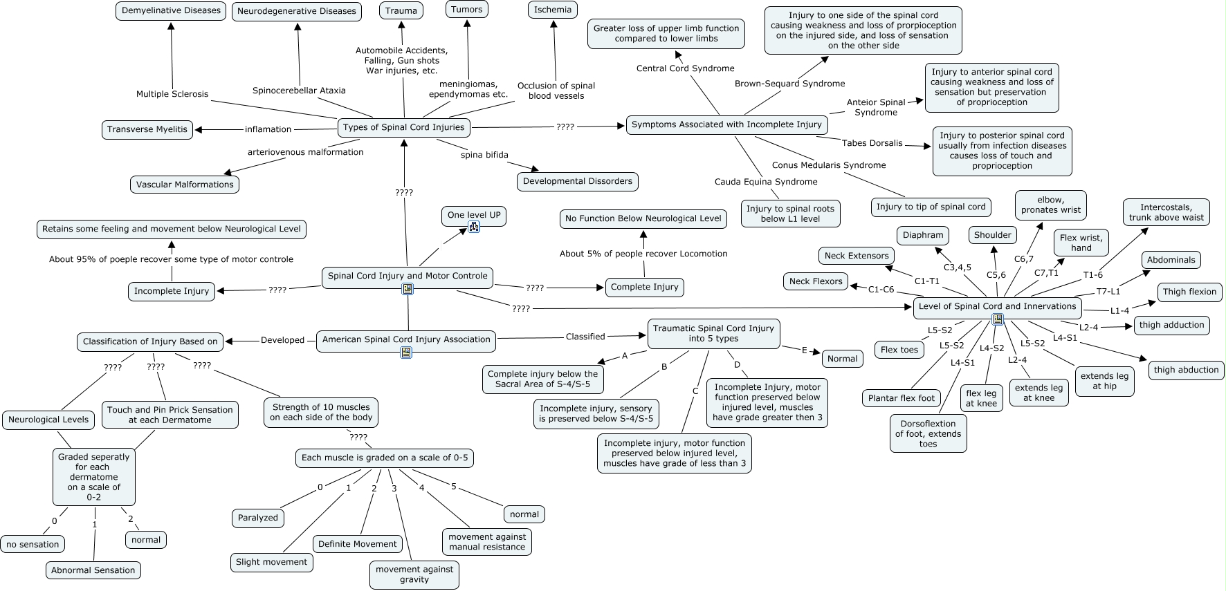 This Concept Map has information related to: Saraceno - Spinal Cord Injury and Motor Controle, Spinal Cord Injury and Motor Controle ???? Incomplete Injury, American Spinal Cord Injury Association Developed Classification of Injury Based on, Level of Spinal Cord and Innervations L4-S2 flex leg at knee, Spinal Cord Injury and Motor Controle ???? American Spinal Cord Injury Association, Traumatic Spinal Cord Injury into 5 types D Incomplete Injury, motor function preserved below injured level, muscles have grade greater then 3, Each muscle is graded on a scale of 0-5 3 movement against gravity, Level of Spinal Cord and Innervations C5,6 Shoulder, Level of Spinal Cord and Innervations C7,T1 Flex wrist, hand, Spinal Cord Injury and Motor Controle ???? Complete Injury, Touch and Pin Prick Sensation at each Dermatome ???? Graded seperatly for each dermatome on a scale of 0-2