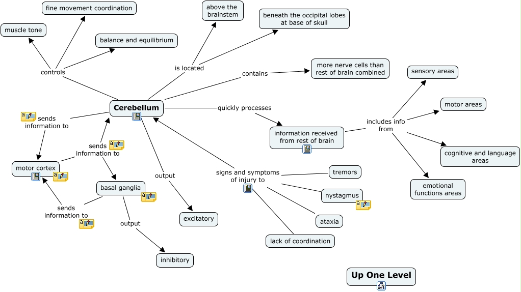 This Concept Map has information related to: Kerr-cerebellum, Cerebellum contains more nerve cells than rest of brain combined, Cerebellum quickly processes information received from rest of brain, Cerebellum sends information to motor cortex, basal ganglia output inhibitory, nystagmus signs and symptoms of injury to Cerebellum, Cerebellum controls muscle tone, motor cortex sends information to basal ganglia, information received from rest of brain includes info from cognitive and language areas, lack of coordination signs and symptoms of injury to Cerebellum, Cerebellum is located beneath the occipital lobes at base of skull