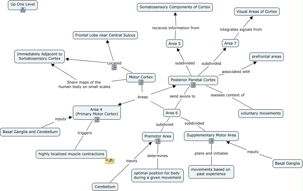 This Concept Map has information related to: Motor Cortex, Posterior Parietal Cortex subdivided Area 7, Motor Cortex Areas Area 6, Motor Cortex Located Immediately Adjacent to Somatosensory Cortex, Area 7 integrates signals from Visual Areas of Cortex, Cerebellum inputs Premotor Area, Area 5 recieves information from Somatosensory Components of Cortex, Area 6 subdivided Supplementary Motor Area, Motor Cortex Areas Area 4 (Primary Motor Cortex), Area 6 subdivied Premotor Area, Premotor Area determines optimal position for body during a given movement