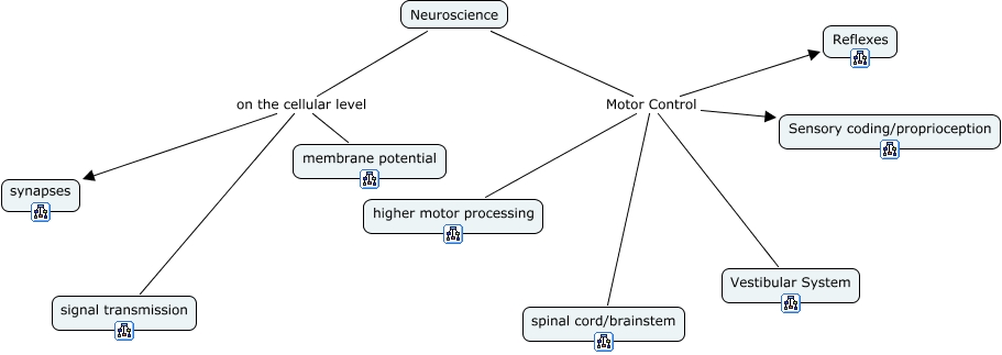 This Concept Map has information related to: BIG Neuroscience map, Neuroscience Motor Control Sensory coding/proprioception, Neuroscience on the cellular level membrane potential, Neuroscience Motor Control higher motor processing, Neuroscience Motor Control Vestibular System, Neuroscience on the cellular level signal transmission, Neuroscience on the cellular level synapses, Neuroscience Motor Control Reflexes, Neuroscience Motor Control spinal cord/brainstem
