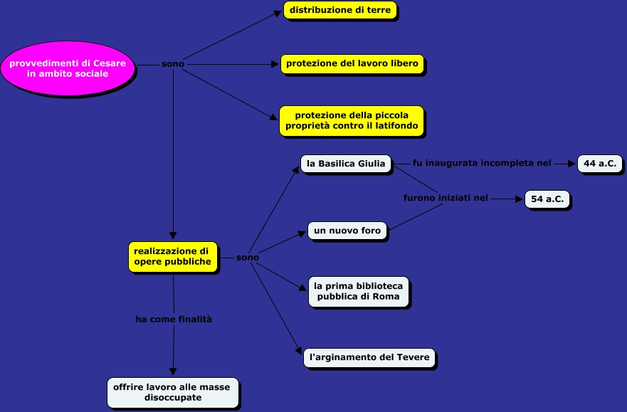 Provvedimenti sociali di Cesare, la Basilica Giulia fu inaugurata incompleta nel 44 a.C., provvedimenti di Cesare in ambito sociale sono distribuzione di terre, provvedimenti di Cesare in ambito sociale sono protezione del lavoro libero, la Basilica Giulia furono iniziati nel 54 a.C., realizzazione di opere pubbliche ha come finalità offrire lavoro alle masse disoccupate, provvedimenti di Cesare in ambito sociale sono realizzazione di opere pubbliche, realizzazione di opere pubbliche sono l'arginamento del Tevere, realizzazione di opere pubbliche sono la Basilica Giulia, realizzazione di opere pubbliche sono un nuovo foro, un nuovo foro furono iniziati nel 54 a.C.