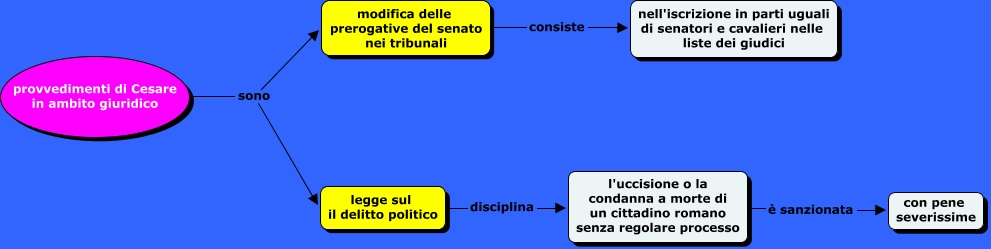Provvedimenti giuridici di Cesare, modifica delle prerogative del senato nei tribunali consiste nell'iscrizione in parti uguali di senatori e cavalieri nelle liste dei giudici, provvedimenti di Cesare in ambito giuridico sono modifica delle prerogative del senato nei tribunali, l'uccisione o la condanna a morte di un cittadino romano senza regolare processo è sanzionata con pene severissime, legge sul il delitto politico disciplina l'uccisione o la condanna a morte di un cittadino romano senza regolare processo, provvedimenti di Cesare in ambito giuridico sono legge sul il delitto politico