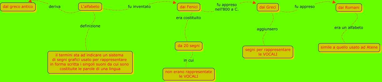 Questa Mappa Concettuale ha informazioni correlate a: L'alfabeto, dai Greci fu appreso dai Romani, dai Fenici fu appreso nell'800 a C. dai Greci, L'alfabeto deriva dal greco antico, dai Greci aggiunsero segni per rappresentare le VOCALI, dai Fenici era costituito da 20 segni, dai Romani era un alfabeto simile a quello usato ad Atene, L'alfabeto definizione il termini sta ad indicare un sistema di segni grafici usato per rappresentare in forma scritta i singoli suoni da cui sono costituite le parole di una lingua, L'alfabeto fu inventato dai Fenici, da 20 segni in cui non erano rappresentate le VOCALI