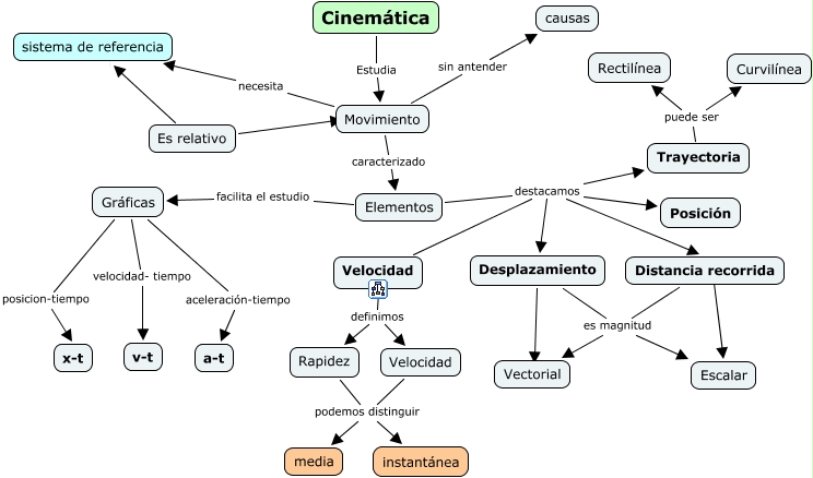 Este mapa conceptual tiene información relacionada a: Cinemática, Distancia recorrida es magnitud Vectorial, Elementos destacamos Desplazamiento, Rapidez podemos distinguir Velocidad, Gráficas aceleración-tiempo a-t, Gráficas velocidad- tiempo v-t, Gráficas posicion-tiempo x-t, Elementos facilita el estudio Gráficas, Elementos destacamos Posición, Velocidad definimos Velocidad, Elementos destacamos Velocidad, Es relativo sistema de referencia, Rapidez podemos distinguir media, Distancia recorrida es magnitud Escalar, Movimiento sin antender causas, Es relativo ???? Movimiento, Elementos destacamos Distancia recorrida, Es relativo sistema de referencia, Distancia recorrida es magnitud Desplazamiento, Cinemática Estudia Movimiento, Desplazamiento ???? Vectorial
