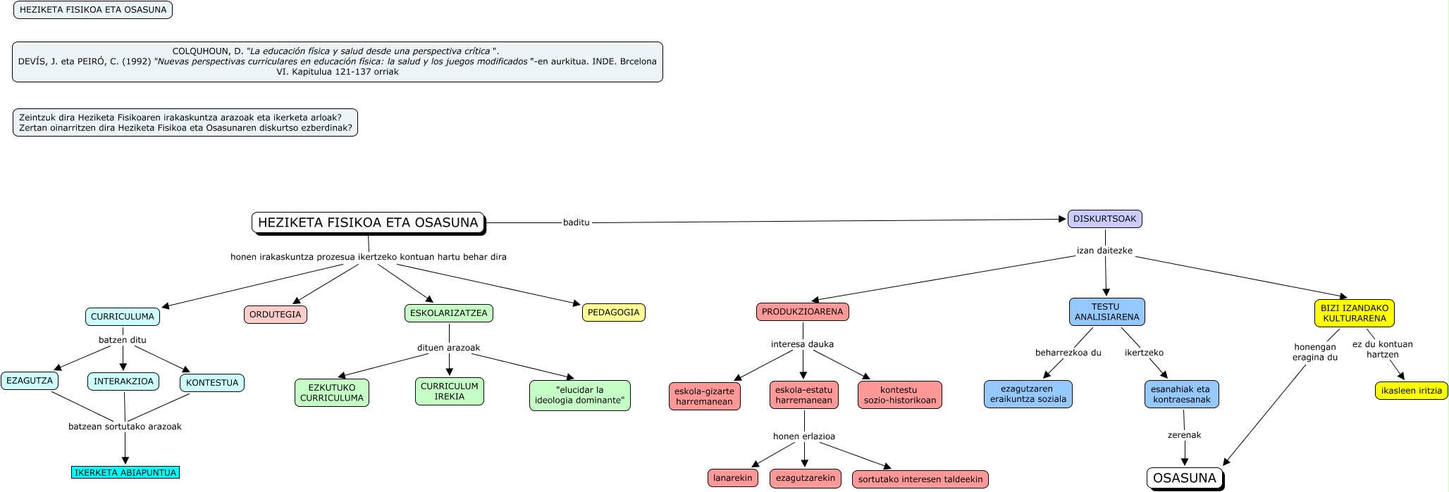 Este mapa conceptual tiene información relacionada a: kapitulu6, HEZIKETA FISIKOA ETA OSASUNA honen irakaskuntza prozesua ikertzeko kontuan hartu behar dira PEDAGOGIA, KONTESTUA batzean sortutako arazoak IKERKETA ABIAPUNTUA, eskola-estatu harremanean honen erlazioa sortutako interesen taldeekin, CURRICULUMA batzen ditu KONTESTUA, eskola-estatu harremanean honen erlazioa lanarekin, DISKURTSOAK izan daitezke TESTU ANALISIARENA, INTERAKZIOA batzean sortutako arazoak IKERKETA ABIAPUNTUA, ESKOLARIZATZEA dituen arazoak EZKUTUKO CURRICULUMA, EZAGUTZA batzean sortutako arazoak IKERKETA ABIAPUNTUA, CURRICULUMA batzen ditu EZAGUTZA, PRODUKZIOARENA interesa dauka eskola-estatu harremanean, HEZIKETA FISIKOA ETA OSASUNA baditu DISKURTSOAK, eskola-estatu harremanean honen erlazioa ezagutzarekin, esanahiak eta kontraesanak zerenak OSASUNA, CURRICULUMA batzen ditu INTERAKZIOA, DISKURTSOAK izan daitezke PRODUKZIOARENA, ESKOLARIZATZEA dituen arazoak "elucidar la ideologia dominante", HEZIKETA FISIKOA ETA OSASUNA honen irakaskuntza prozesua ikertzeko kontuan hartu behar dira ORDUTEGIA, BIZI IZANDAKO KULTURARENA honengan eragina du OSASUNA, BIZI IZANDAKO KULTURARENA ez du kontuan hartzen ikasleen iritzia