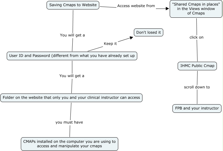 This Concept Map, created with IHMC CmapTools, has information related to: Saving Cmaps to IHMC Website, "Shared Cmaps in places" in the Views window of Cmaps click on IHMC Public Cmap, User ID and Password (different from what you have already set up Keep it Don't losed it, IHMC Public Cmap scroll down to FPB and your instructor, Folder on the website that only you and your clinical instructor can access you must have CMAPs installed on the computer you are using to access and manipulate your cmaps, Saving Cmaps to Website You will get a User ID and Password (different from what you have already set up, Saving Cmaps to Website Access website from "Shared Cmaps in places" in the Views window of Cmaps, User ID and Password (different from what you have already set up You will get a Folder on the website that only you and your clinical instructor can access