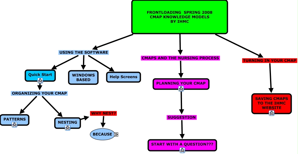 This Concept Map, created with IHMC CmapTools, has information related to: FRONTLOADING SPRING 2008- OUTLINE, PLANNING YOUR CMAP SUGGESTION START WITH A QUESTION???, FRONTLOADING SPRING 2008 CMAP KNOWLEDGE MODELS BY IHMC USING THE SOFTWARE Help Screens, FRONTLOADING SPRING 2008 CMAP KNOWLEDGE MODELS BY IHMC TURNING IN YOUR CMAP SAVING CMAPS TO THE IHMC WEBSITE, FRONTLOADING SPRING 2008 CMAP KNOWLEDGE MODELS BY IHMC USING THE SOFTWARE WINDOWS BASED, NESTING WHY NEST? BECAUSE, FRONTLOADING SPRING 2008 CMAP KNOWLEDGE MODELS BY IHMC USING THE SOFTWARE Quick Start, Quick Start ORGANIZING YOUR CMAP NESTING, Quick Start ORGANIZING YOUR CMAP PATTERNS, FRONTLOADING SPRING 2008 CMAP KNOWLEDGE MODELS BY IHMC CMAPS AND THE NURSING PROCESS PLANNING YOUR CMAP