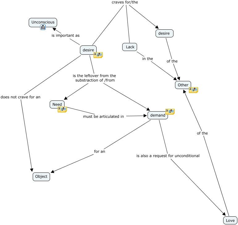 This Concept Map, created with IHMC CmapTools, has information related to: Desire, demand is also a request for unconditional Love, desire is the leftover from the substraction of /from Need, desire is important as Unconscious, Need must be articulated in demand, Love of the Other, desire craves for/the Lack, desire of the Other, desire craves for/the desire, Lack in the Other, demand for an Object, desire does not crave for an Object, desire is the leftover from the substraction of /from demand