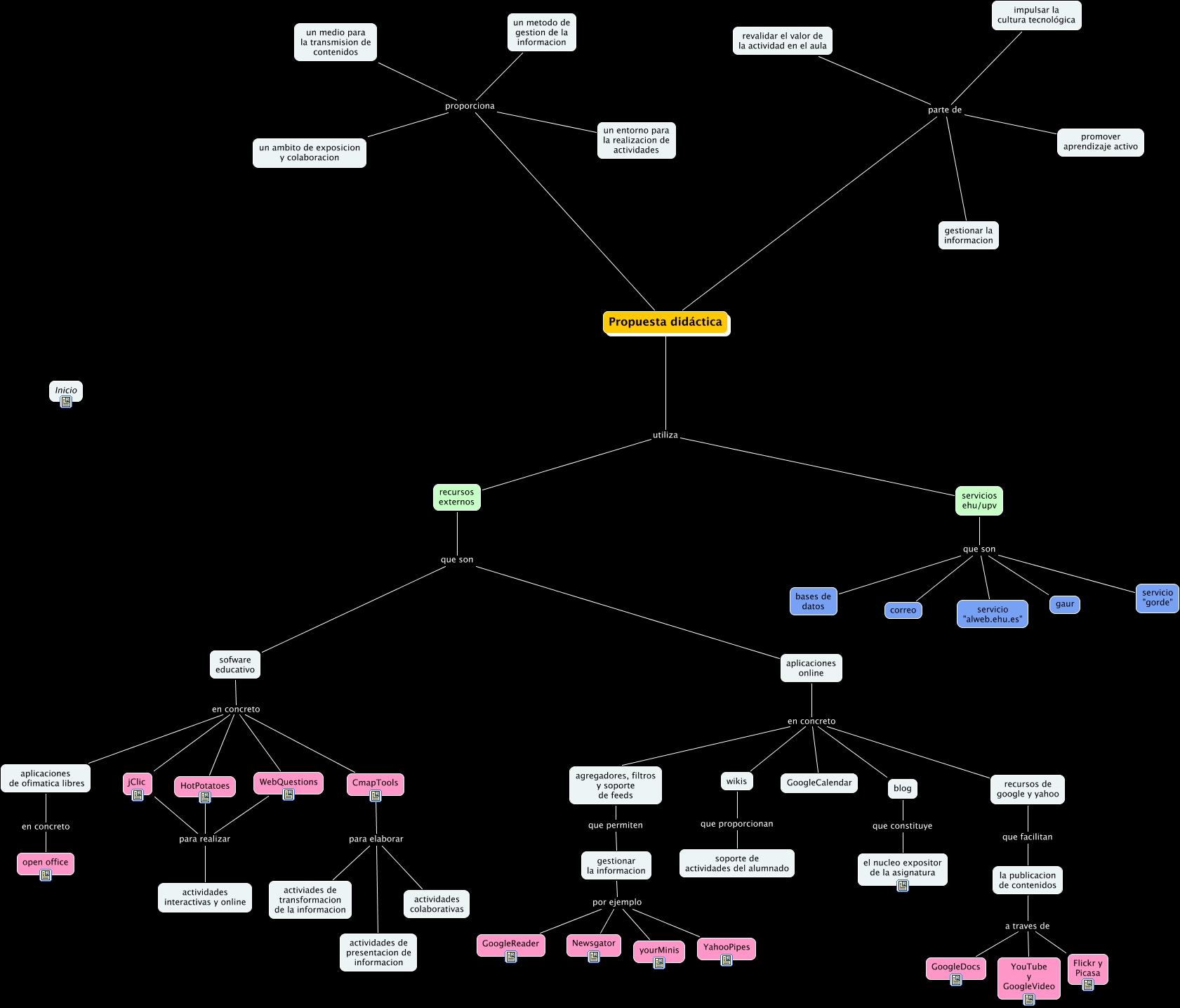 This Concept Map has information related to: propuesta didáctica, gestionar la informacion por ejemplo Newsgator, HotPotatoes para realizar actividades interactivas y online, recursos externos que son aplicaciones online, jClic para realizar actividades interactivas y online, wikis que proporcionan soporte de actividades del alumnado, recursos externos que son sofware educativo, CmapTools para elaborar actividades de presentacion de informacion, sofware educativo en concreto aplicaciones de ofimatica libres, sofware educativo en concreto WebQuestions, servicios ehu/upv que son bases de datos
