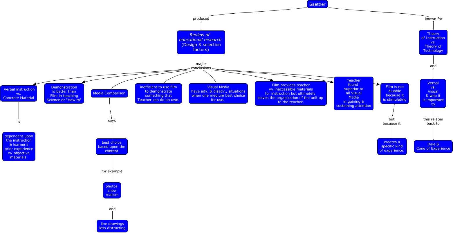 Saettler, Review of educational research (Design & selection factors) major conclusions Film provides teacher w/ inaccessible materials for instruction but ultimately leaves the organization of the unit up to the teacher., Review of educational research (Design & selection factors) major conclusions Media Comparison, Verbal vs. Visual & who it is important to this relates back to Dale & Cone of Experience, Verbal instruction vs. Concrete Material is dependent upon the instruction & learner's prior experience w/ objective materials., Review of educational research (Design & selection factors) major conclusions Verbal instruction vs. Concrete Material, Review of educational research (Design & selection factors) major conclusions Demonstration is better than Film in teaching Science or "How to", Film is not aluable because it is stimulating but because it creates a specific kind of experience., Theory of Instruction vs. Theory of Technology and Verbal vs. Visual & who it is important to, Review of educational research (Design & selection factors) major conclusions inefficient to use film to demonstrate something that Teacher can do on own., Saettler produced Review of educational research (Design & selection factors)