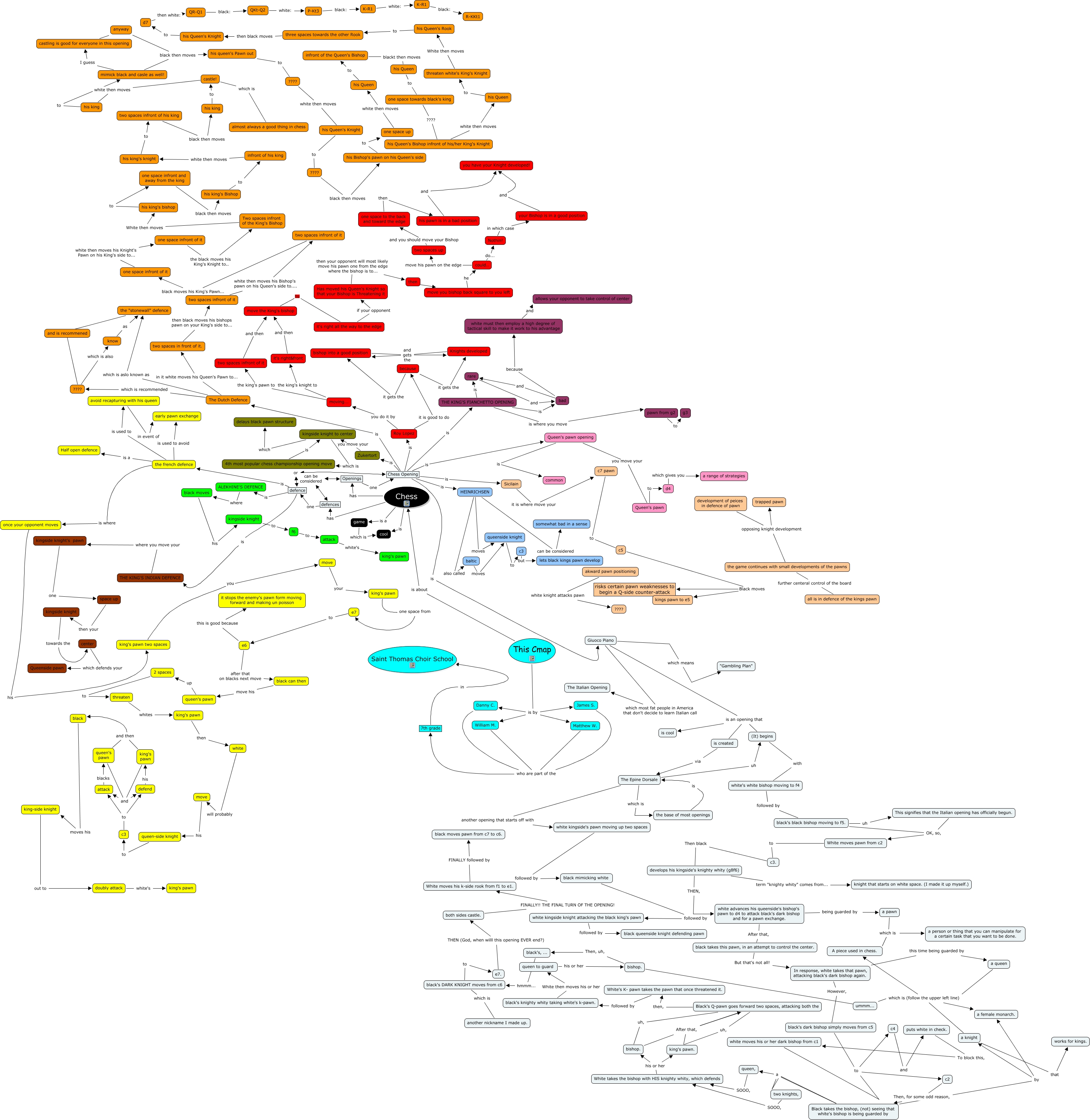 This Concept Map, created with IHMC CmapTools, has information related to: Several Chess Openings, his Queen's Bishop infront of his/her King's Knight white then moves his Queen, c5 Black moves risks certain pawn weaknesses to begin a Q-side counter-attack, 4th most popular chess championship opening move is kingside knight to center, both sides castle. FINALLY!! THE FINAL TURN OF THE OPENING! White moves his k-side rook from f1 to e1., two knights, SOOO, White takes the bishop with HIS knighty whity, which defends, threaten white's King's Knight White then moves his Queen's Rook, Matthew W. who are part of the 7th grade, This Cmap is by Danny C., a pawn which is A piece used in chess., defend his king's pawn, 7th grade in Saint Thomas Choir School, Black's Q-pawn goes forward two spaces, attacking both the uh, bishop., white kingside knight attacking the black king's pawn followed by black queenside knight defending pawn, Knights developed and gets the bishop into a good position, defences can be considered Openings, threaten whites king's pawn, White moves pawn from c2 to c3., two spaces infront of it black moves his King's Pawn... one space infront of it, THE KING'S FIANCHETTO OPENING is where you move pawn from g2, Chess Opening is The Dutch Defence