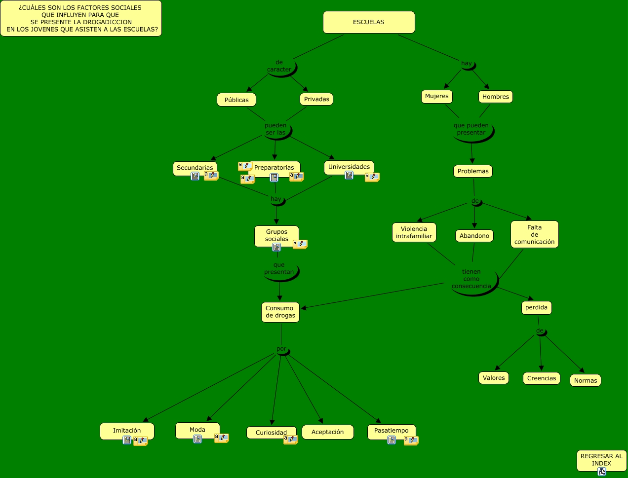 Este mapa conceptual tiene información relacionada a: DROGADICCIÓN EN LAS ESCUELAS, perdida de Normas, Problemas de Falta de comunicación, Consumo de drogas por Aceptación, ESCUELAS hay Mujeres, Consumo de drogas por Curiosidad, Violencia intrafamiliar tienen como consecuencia Consumo de drogas, perdida de Creencias, Consumo de drogas por Moda, Violencia intrafamiliar tienen como consecuencia perdida, perdida de Valores