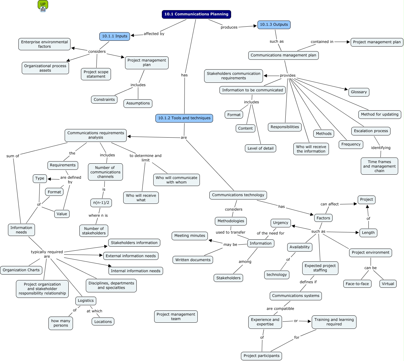 This Concept Map, created with IHMC CmapTools, has information related to: 10.1 Communications Planning, Information needs typically required are Logistics, Logistics at which Locations, 10.1.1 Inputs considers Project scope statement, Communications management plan provides Glossary, 10.1.1 Inputs considers Enterprise environmental factors, Factors such as Urgency, Communications requirements analysis to determine and limit Who will receive what, Factors such as Project environment, Information to be communicated includes Level of detail, Information may be Meeting minutes, 10.1 Communications Planning affected by 10.1.1 Inputs, Project environment can be Face-to-face, Project management plan includes Assumptions, Expected project staffing defines if Communications systems, Escalation process identifying Time frames and management chain, Information needs typically required are Disciplines, departments and specialties, Factors such as Length, n(n-1)/2 where n is Number of stakeholders, Communications management plan contained in Project management plan, 10.1 Communications Planning produces 10.1.3 Outputs
