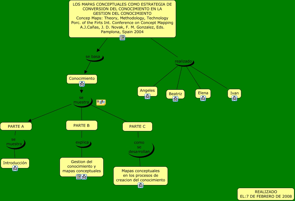 Este mapa conceptual tiene información relacionada a: ARTICULO DE MAPAS CONCEPTUALES COMO ESTRATEGIA (PAGINA PRINCIPAL), LOS MAPAS CONCEPTUALES COMO ESTRATEGIA DE CONVERSION DEL CONOCIMIENTO EN LA GESTION DEL CONOCIMIENTO Concep Maps: Theory, Methodology, Technology Porc. of the Firts Int. Conference on Concept Mapping A.J.Cañas, J. D. Novak, F. M. Gonzalez, Eds. Pamplona, Spain 2004 se basa Conocimiento, PARTE A se muestra Introducción, PARTE B explica Gestion del conocimiento y mapas conceptuales, Conocimiento se muestra PARTE C, LOS MAPAS CONCEPTUALES COMO ESTRATEGIA DE CONVERSION DEL CONOCIMIENTO EN LA GESTION DEL CONOCIMIENTO Concep Maps: Theory, Methodology, Technology Porc. of the Firts Int. Conference on Concept Mapping A.J.Cañas, J. D. Novak, F. M. Gonzalez, Eds. Pamplona, Spain 2004 realizado Beatriz, LOS MAPAS CONCEPTUALES COMO ESTRATEGIA DE CONVERSION DEL CONOCIMIENTO EN LA GESTION DEL CONOCIMIENTO Concep Maps: Theory, Methodology, Technology Porc. of the Firts Int. Conference on Concept Mapping A.J.Cañas, J. D. Novak, F. M. Gonzalez, Eds. Pamplona, Spain 2004 realizado Angeles, LOS MAPAS CONCEPTUALES COMO ESTRATEGIA DE CONVERSION DEL CONOCIMIENTO EN LA GESTION DEL CONOCIMIENTO Concep Maps: Theory, Methodology, Technology Porc. of the Firts Int. Conference on Concept Mapping A.J.Cañas, J. D. Novak, F. M. Gonzalez, Eds. Pamplona, Spain 2004 realizado Ivan, Conocimiento se muestra PARTE A, Conocimiento se muestra PARTE B, LOS MAPAS CONCEPTUALES COMO ESTRATEGIA DE CONVERSION DEL CONOCIMIENTO EN LA GESTION DEL CONOCIMIENTO Concep Maps: Theory, Methodology, Technology Porc. of the Firts Int. Conference on Concept Mapping A.J.Cañas, J. D. Novak, F. M. Gonzalez, Eds. Pamplona, Spain 2004 realizado Elena, PARTE C como se desarrollan Mapas conceptuales en los procesos de creacion del conocimiento