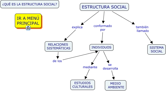 Este mapa conceptual tiene información relacionada a: estructura social, INDIVIDUOS se desarrolla MEDIO AMBIENTE, RELACIONES SISTEM�?TICAS de los INDIVIDUOS, INDIVIDUOS mediante ESTUDIOS CULTURALES, ESTRUCTURA SOCIAL también llamado SISTEMA SOCIAL, ESTRUCTURA SOCIAL explica RELACIONES SISTEM�?TICAS, ESTRUCTURA SOCIAL conformado por INDIVIDUOS