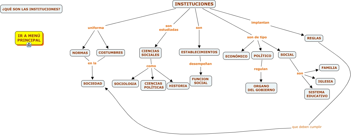 Este mapa conceptual tiene información relacionada a: instituciones, INSTITUCIONES uniforma NORMAS, INSTITUCIONES son ESTABLECIMIENTOS, COSTUMBRES en la SOCIEDAD, SOCIAL son SISTEMA EDUCATIVO, SOCIAL son IGLESIA, INSTITUCIONES son de tipo ECONÓMICO, INSTITUCIONES uniforma COSTUMBRES, CIENCIAS SOCIALES como CIENCIAS POL�?TICAS, REGLAS que deben cumplir SOCIEDAD, ESTABLECIMIENTOS desempeñan FUNCION SOCIAL