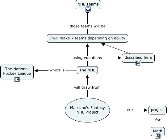 This Concept Map, created with IHMC CmapTools, has information related to: Massimo's Fantasy NHL Project, The NHL which is The National Hockey League, The NHL using equations described here, Massimo's Fantasy NHL Project is a project, I will make 7 teams depending on ability those teams will be NHL Teams, described here ???? I will make 7 teams depending on ability, The NHL using equations I will make 7 teams depending on ability, Massimo's Fantasy NHL Project will draw from The NHL, project for Math