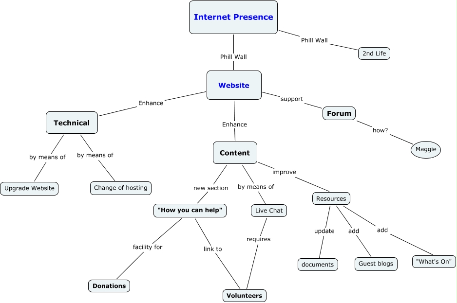 This Concept Map, created with IHMC CmapTools, has information related to: Internet Presence, Website Enhance Content, Website support Forum, "How you can help" facility for Donations, Technical by means of Change of hosting, Content new section "How you can help", Forum how? Maggie, "How you can help" link to Volunteers, Internet Presence Phill Wall 2nd Life, Content by means of Live Chat, Live Chat requires Volunteers, Technical by means of Upgrade Website, Resources update documents, Internet Presence Phill Wall Website, Resources add "What's On", Website Enhance Technical, Resources add Guest blogs, Content improve Resources