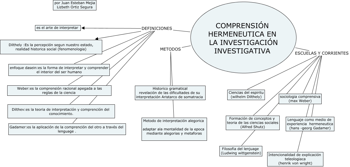 mapa conceptual investigación hermeneutica, COMPRENSIÓN HERMENEUTICA EN LA INVESTIGACIÓN INVESTIGATIVA ESCUELAS Y CORRIENTES sociologia comprensiva (max Weber), COMPRENSIÓN HERMENEUTICA EN LA INVESTIGACIÓN INVESTIGATIVA ESCUELAS Y CORRIENTES Filosofia del lenjuage (Ludwing wittgenstein), COMPRENSIÓN HERMENEUTICA EN LA INVESTIGACIÓN INVESTIGATIVA METODOS Metodo de interpretación alegorica adaptar ala mentalidad de la epoca mediante alegorias y metaforas, COMPRENSIÓN HERMENEUTICA EN LA INVESTIGACIÓN INVESTIGATIVA DEFINICIONES Weber:es la comprensión racional apegada a las reglas de la ciencia, COMPRENSIÓN HERMENEUTICA EN LA INVESTIGACIÓN INVESTIGATIVA DEFINICIONES es el arte de interpretar, COMPRENSIÓN HERMENEUTICA EN LA INVESTIGACIÓN INVESTIGATIVA METODOS Historico gramatical revelación de las dificultades de su interpretación Aristarco de somatracia, COMPRENSIÓN HERMENEUTICA EN LA INVESTIGACIÓN INVESTIGATIVA ESCUELAS Y CORRIENTES Formación de conceptos y teoria de las ciencias sociales (Alfred Shutz), COMPRENSIÓN HERMENEUTICA EN LA INVESTIGACIÓN INVESTIGATIVA ESCUELAS Y CORRIENTES Ciencias del espiritu (wilhelm Dilthely), COMPRENSIÓN HERMENEUTICA EN LA INVESTIGACIÓN INVESTIGATIVA DEFINICIONES Gadamer:es la aplicación de la comprención del otro a través del lenguage ., COMPRENSIÓN HERMENEUTICA EN LA INVESTIGACIÓN INVESTIGATIVA ESCUELAS Y CORRIENTES Intencionalidad de explicación teleologiaca (henrik von wright)
