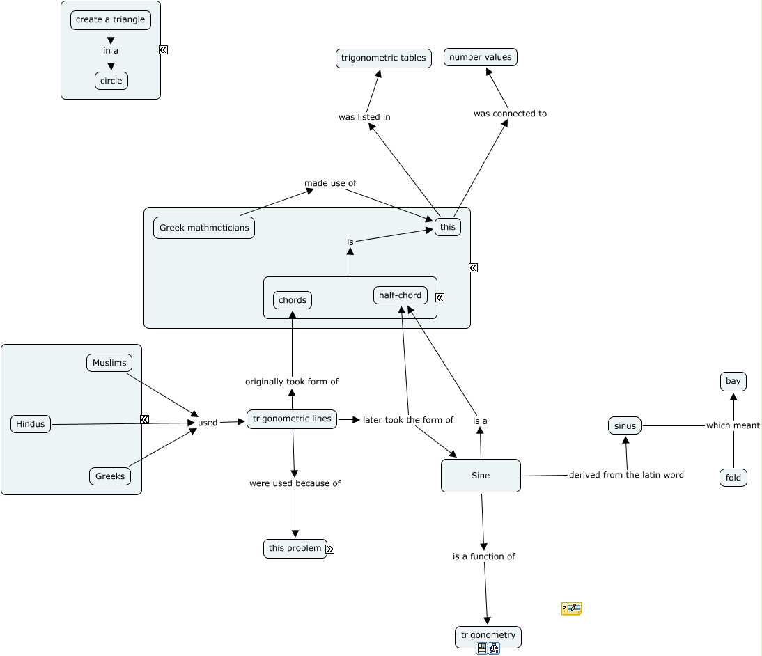 This Concept Map, created with IHMC CmapTools, has information related to: Sine( and its history), this was listed in trigonometric tables, sinus which meant bay, trigonometric lines originally took form of chords, Muslims used trigonometric lines, sinus which meant fold, Sine is a function of trigonometry, Hindus used trigonometric lines, trigonometric lines later took the form of half-chord, trigonometric lines were used because of this problem, trigonometric lines later took the form of Sine, in early times there was not a trigonometric ratio, Greeks used trigonometric lines, this set is this, this was connected to number values, create a triangle in a circle, Sine derived from the latin word sinus, Greek mathmeticians made use of this, Sine is a half-chord
