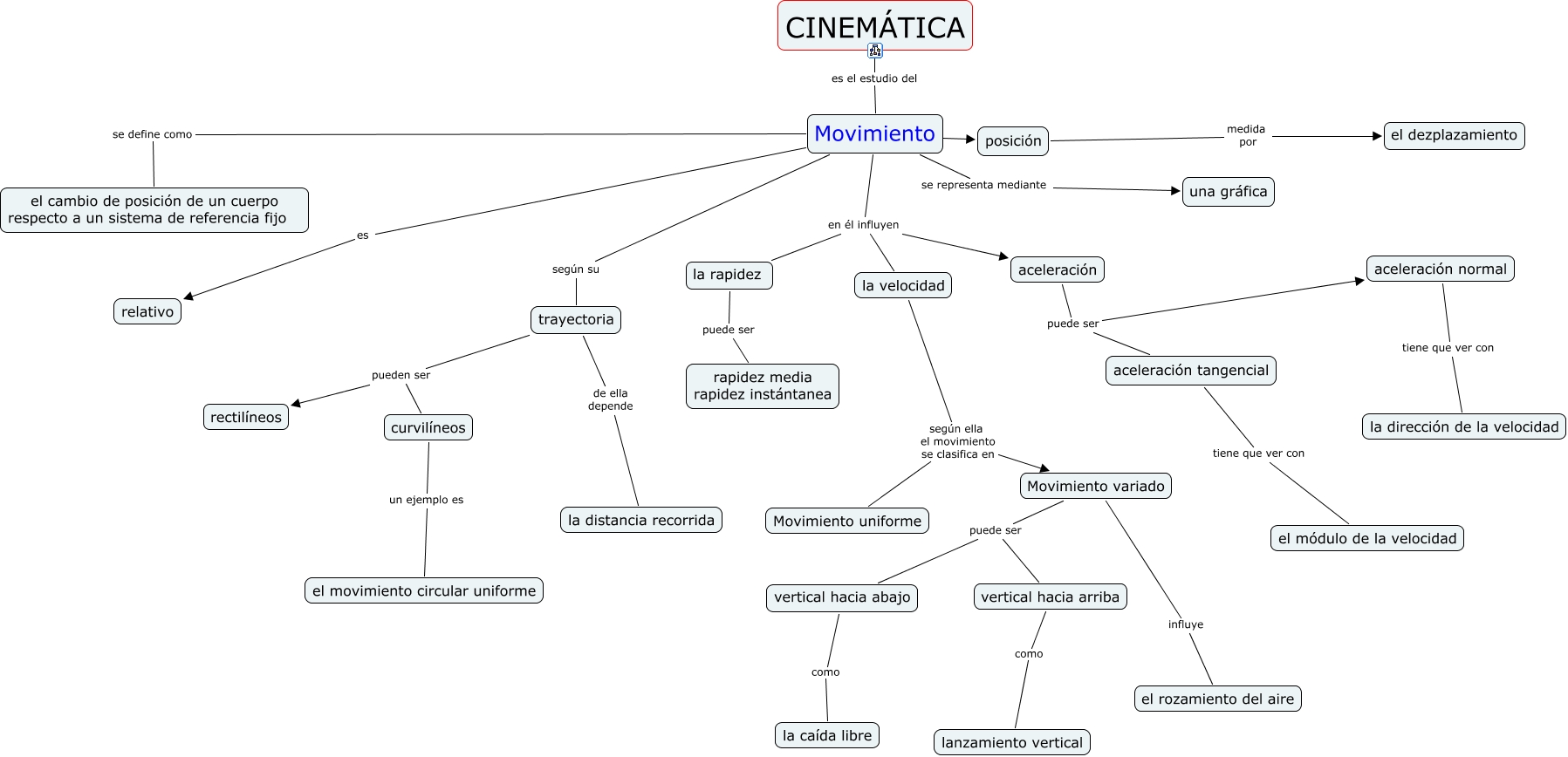 Este mapa conceptual tiene información relacionada a: CinemáticaAlbertoNJavier, CINEMÁTICA es el estudio del Movimiento, aceleración normal tiene que ver con la dirección de la velocidad, trayectoria pueden ser curvilíneos, Movimiento en él influyen la rapidez, aceleración puede ser aceleración tangencial, trayectoria pueden ser rectilíneos, Movimiento ???? posición, trayectoria de ella depende la distancia recorrida, la rapidez puede ser rapidez media rapidez instántanea, Movimiento se define como el cambio de posición de un cuerpo respecto a un sistema de referencia fijo, Movimiento es relativo, vertical hacia arriba como lanzamiento vertical, la velocidad según ella el movimiento se clasifica en Movimiento variado, vertical hacia abajo como la caída libre, posición medida por el dezplazamiento, la velocidad según ella el movimiento se clasifica en Movimiento uniforme, Movimiento en él influyen la velocidad, Movimiento en él influyen aceleración, Movimiento se representa mediante una gráfica, Movimiento variado puede ser vertical hacia abajo