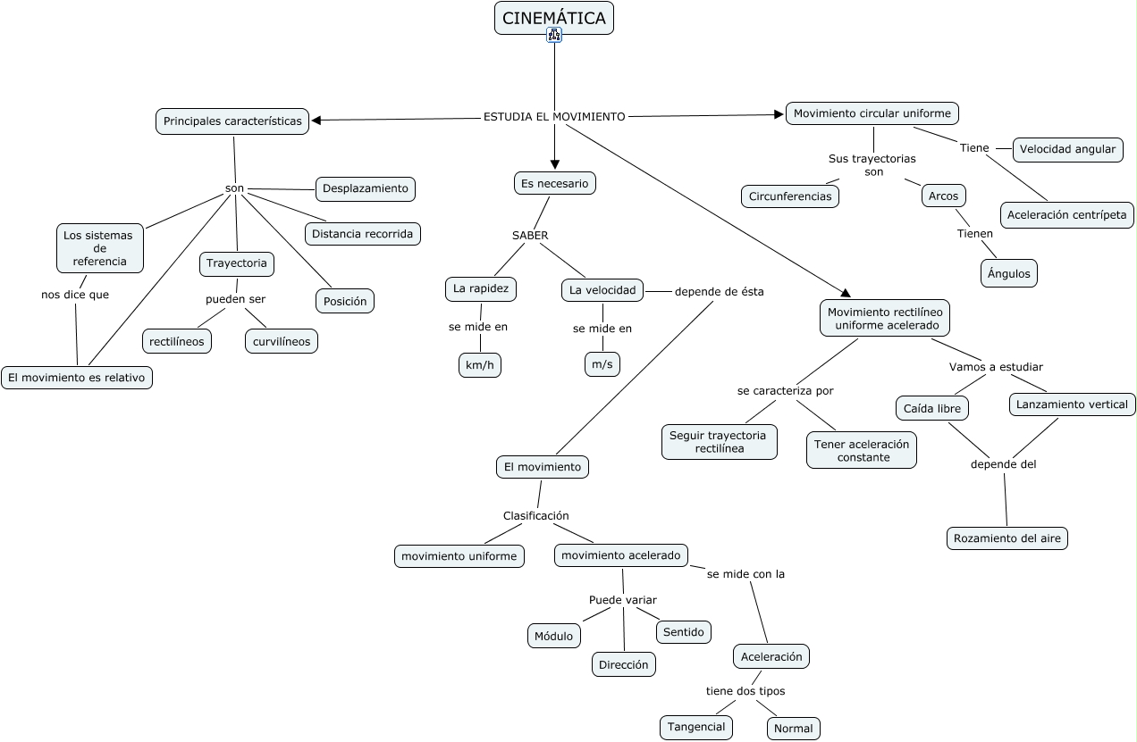 Este mapa conceptual tiene información relacionada a: CinemáticaJuliaDavidJoseLuis, Principales características son Distancia recorrida, Arcos Tienen Ángulos, CINEMÁTICA ESTUDIA EL MOVIMIENTO Movimiento rectilíneo uniforme acelerado, La velocidad depende de ésta El movimiento, La rapidez se mide en km/h, movimiento acelerado Puede variar Módulo, Movimiento rectilíneo uniforme acelerado Vamos a estudiar Lanzamiento vertical, Movimiento circular uniforme Tiene Velocidad angular, Aceleración tiene dos tipos Normal, movimiento acelerado se mide con la Aceleración, Trayectoria pueden ser rectilíneos, Es necesario SABER La rapidez, CINEMÁTICA ESTUDIA EL MOVIMIENTO Movimiento circular uniforme, Movimiento circular uniforme Sus trayectorias son Circunferencias, Principales características son Posición, El movimiento Clasificación movimiento uniforme, Trayectoria pueden ser curvilíneos, CINEMÁTICA ESTUDIA EL MOVIMIENTO Principales características, Lanzamiento vertical depende del Rozamiento del aire, Principales características son Trayectoria