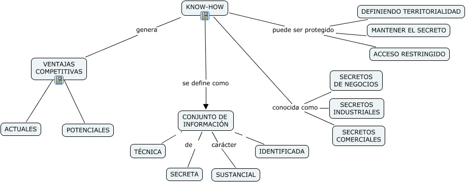 Este mapa conceptual tiene información relacionada a: KNOW-HOW, KNOW-HOW puede ser protegido ACCESO RESTRINGIDO, KNOW-HOW se define como CONJUNTO DE INFORMACIÓN, KNOW-HOW puede ser protegido MANTENER EL SECRETO, CONJUNTO DE INFORMACIÓN TÉCNICA, KNOW-HOW genera VENTAJAS COMPETITIVAS, VENTAJAS COMPETITIVAS ???? POTENCIALES, VENTAJAS COMPETITIVAS ???? ACTUALES, KNOW-HOW conocida como SECRETOS COMERCIALES, CONJUNTO DE INFORMACIÓN de carácter SECRETA, KNOW-HOW conocida como SECRETOS INDUSTRIALES, CONJUNTO DE INFORMACIÓN SUSTANCIAL, KNOW-HOW conocida como SECRETOS DE NEGOCIOS, CONJUNTO DE INFORMACIÓN IDENTIFICADA, KNOW-HOW puede ser protegido DEFINIENDO TERRITORIALIDAD