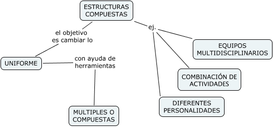 Este mapa conceptual tiene información relacionada a: ESTRUCTURAS COMPUESTAS, ESTRUCTURAS COMPUESTAS ej. DIFERENTES PERSONALIDADES, ESTRUCTURAS COMPUESTAS ej. COMBINACIÓN DE ACTIVIDADES, UNIFORME con ayuda de herramientas MULTIPLES O COMPUESTAS, ESTRUCTURAS COMPUESTAS el objetivo es cambiar lo UNIFORME, ESTRUCTURAS COMPUESTAS ej. EQUIPOS MULTIDISCIPLINARIOS