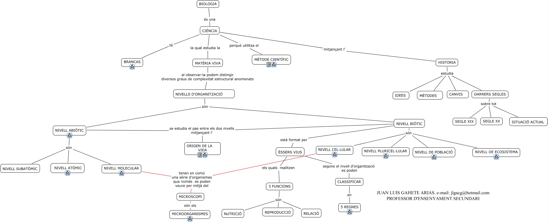 biologia, NIVELLS D'ORGANITZACIÓ són NIVELL ABIÒTIC, BIOLOGIA és una CIÈNCIA, NIVELL ABIÒTIC són NIVELL MOLECULAR, NIVELL BIÒTIC són NIVELL DE ECOSISTEMA, CIÈNCIA mitjançant l' HISTORIA, ÉSSERS VIUS els quals realitzen 3 FUNCIONS, DARRERS SEGLES sobre tot SEGLE XIX, 3 FUNCIONS són REPRODUCCIÓ, CIÈNCIA té BRANCAS, DARRERS SEGLES sobre tot SITUACIÓ ACTUAL