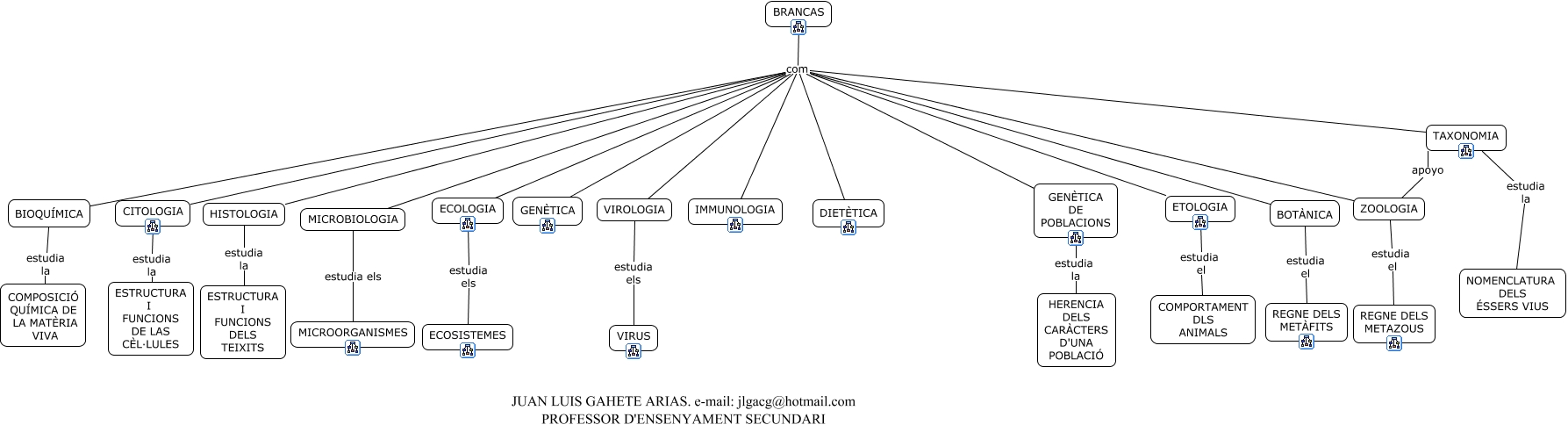 Este Cmap, tiene información relacionada con: ramas, BRANCAS com DIETÈTICA, ECOLOGIA estudia els ECOSISTEMES, ZOOLOGIA estudia el REGNE DELS METAZOUS, BRANCAS com ETOLOGIA, BRANCAS com HISTOLOGIA, BRANCAS com ECOLOGIA, BIOQUÍMICA estudia la COMPOSICIÓ QUÍMICA DE LA MATÈRIA VIVA, BRANCAS com TAXONOMIA, BRANCAS com IMMUNOLOGIA, BRANCAS com MICROBIOLOGIA, MICROBIOLOGIA estudia els MICROORGANISMES, BRANCAS com ZOOLOGIA, ZOOLOGIA apoyo TAXONOMIA, HISTOLOGIA estudia la ESTRUCTURA I FUNCIONS DELS TEIXITS, ETOLOGIA estudia el COMPORTAMENT DLS ANIMALS, VIROLOGIA estudia els VIRUS, BRANCAS com CITOLOGIA, CITOLOGIA estudia la ESTRUCTURA I FUNCIONS DE LAS CÈL·LULES, BRANCAS com VIROLOGIA, BOTÀNICA estudia el REGNE DELS METÀFITS