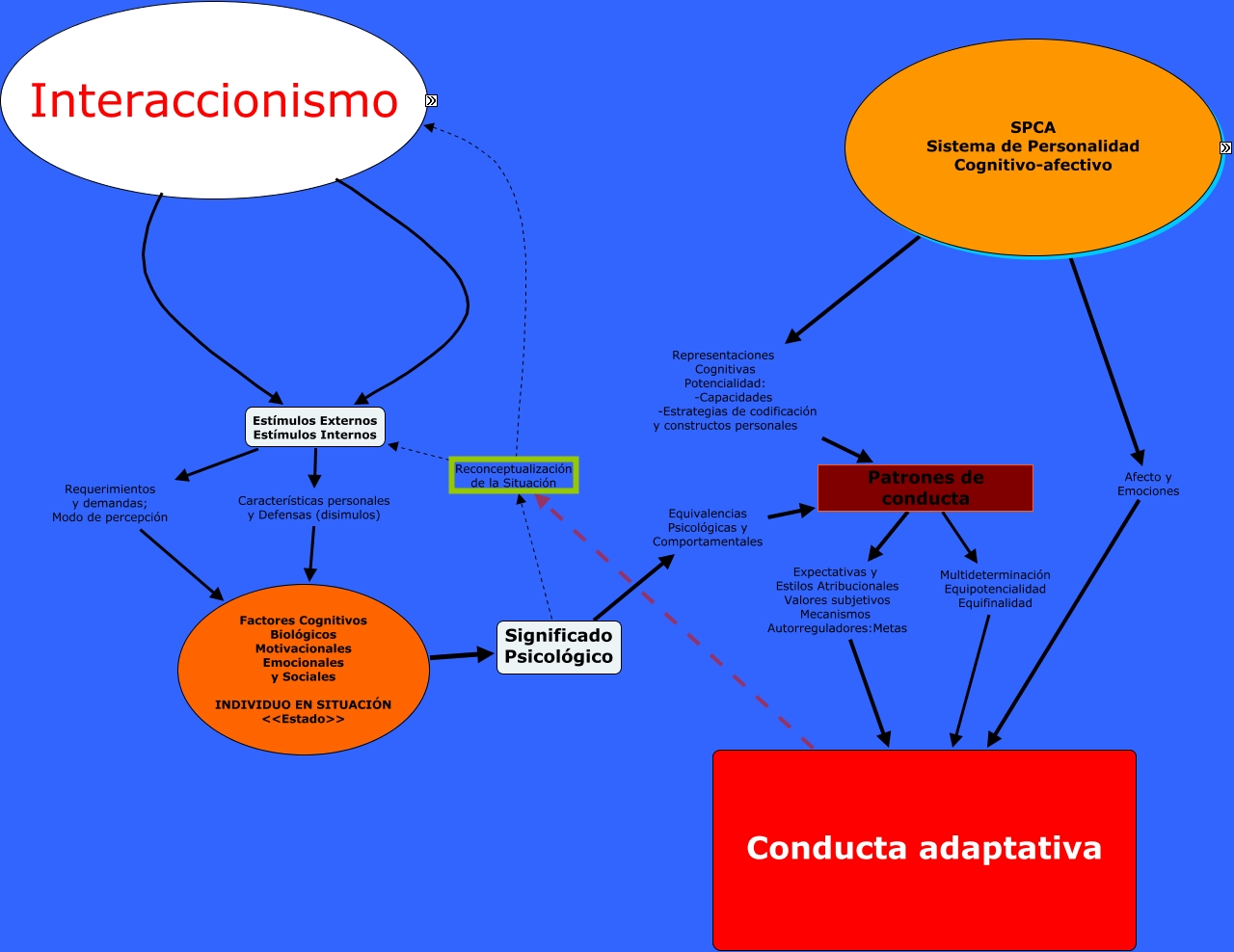 Este Cmap, tiene información relacionada con: mapa1_tema8, Significado Psicológico Reconceptualización de la Situación Interaccionismo, Estímulos Externos Estímulos Internos Requerimientos y demandas; Modo de percepción Factores Cognitivos Biológicos Motivacionales Emocionales y Sociales INDIVIDUO EN SITUACIÓN <<Estado>>, Accesibilidad crónica representación de competencia SPCA, SPCA Sistema de Personalidad Cognitivo-afectivo Afecto y Emociones Conducta adaptativa, Situación SPCA, Factores Cognitivos Biológicos Motivacionales Emocionales y Sociales INDIVIDUO EN SITUACIÓN <<Estado>> Significado Psicológico, Patrones de conducta Multideterminación Equipotencialidad Equifinalidad Conducta adaptativa, Patrones de conducta Expectativas y Estilos Atribucionales Valores subjetivos Mecanismos Autorreguladores:Metas Conducta adaptativa, Organización estable de relaciones diferencias indiv. SPCA, Patrón de Relaciones Situación-contexto Unidades Condicionales SI... ENTONCES... SPCA, PERSONA Rasgos Conducta Determinada, PERSONA SELECCIÓN Y CONSTRUCCIÓN Situación, Situación E-R Conducta Determinada, Estímulos Externos Estímulos Internos Características personales y Defensas (disimulos) Factores Cognitivos Biológicos Motivacionales Emocionales y Sociales INDIVIDUO EN SITUACIÓN <<Estado>>, PERSONA ELECCIÓN Y MODIFICACIÓN Situación, Situación Estímulos Externos Estímulos Internos, Significado Psicológico Reconceptualización de la Situación Estímulos Externos Estímulos Internos, Conducta adaptativa Reconceptualización de la Situación Estímulos Externos Estímulos Internos, PERSONA Estímulos Externos Estímulos Internos, Significado Psicológico Equivalencias Psicológicas y Comportamentales Patrones de conducta