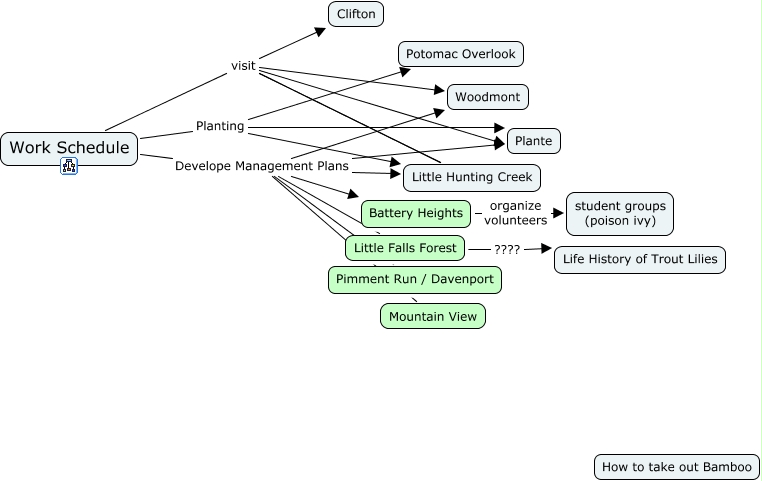 This Concept Map, created with IHMC CmapTools, has information related to: Work Schedule, Work Schedule Develope Management Plans Battery Heights, Work Schedule Develope Management Plans Little Hunting Creek, Work Schedule Planting Little Hunting Creek, Work Schedule Planting Potomac Overlook, Work Schedule Develope Management Plans Little Falls Forest, Work Schedule Develope Management Plans Woodmont, Battery Heights organize volunteers student groups (poison ivy), Work Schedule Develope Management Plans Mountain View, Work Schedule Planting Plante, Work Schedule visit Plante, Work Schedule visit Clifton, Little Falls Forest ???? Life History of Trout Lilies, Work Schedule visit Little Hunting Creek, Work Schedule Develope Management Plans Plante, Work Schedule visit Woodmont, Work Schedule Develope Management Plans Pimment Run / Davenport, Work Schedule visit Little Hunting Creek