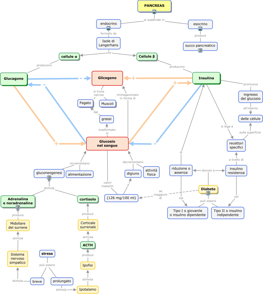 Questa Mappa Concettuale ha informazioni correlate a: Pancreas, Insulina si lega a recettori specifici, insulino resistenza nel Tipo II o insulino indipendente, Sistema nervoso simpatico stimola Midollare del surrene, Glucosio nel sangue - Glucagone, Ipotalamo stimola Ipofisi, Isole di Langerhans con cellule α, Glucosio nel sangue trasformato in grassi, endocrino formato da Isole di Langerhans, Corticale surrenale produce cortisolo, recettori specifici sulla superficie delle cellule, stress può essere prolungato, Isole di Langerhans con Cellule β, Glucosio nel sangue + Insulina, riduzione o assenza di Insulina, Diabete dovuto a riduzione o assenza, breve stimola Sistema nervoso simpatico, Glucagone + Glucosio nel sangue, Glucagone - Glicogeno, Insulina promuove ingresso del glucosio, PANCREAS si suddivide in esocrino