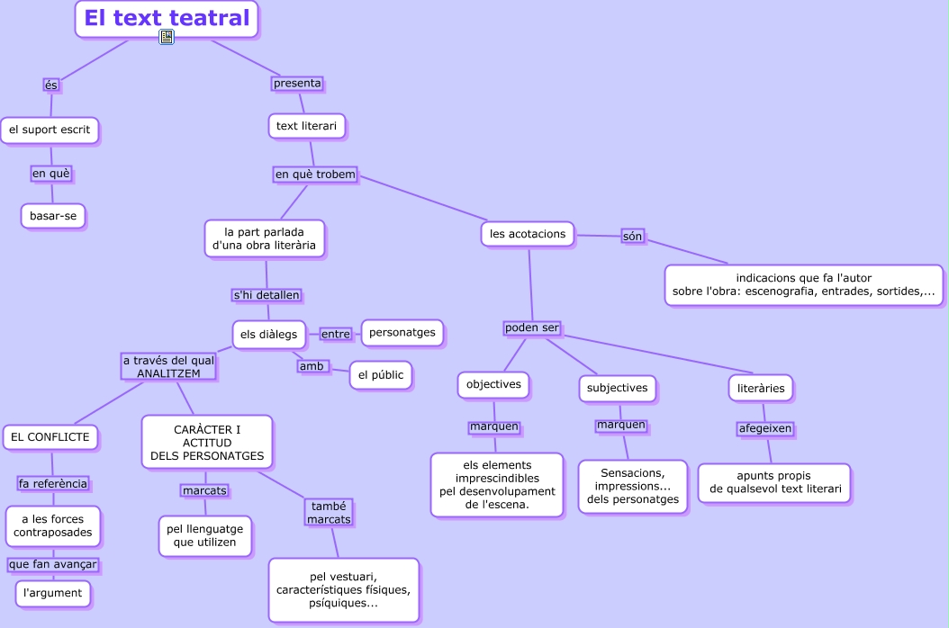 Este Cmap, tiene información relacionada con: text teatral, les acotacions poden ser objectives, subjectives marquen Sensacions, impressions... dels personatges, CARÀCTER I ACTITUD DELS PERSONATGES marcats pel llenguatge que utilizen, el suport escrit en què basar-se, les acotacions són indicacions que fa l'autor sobre l'obra: escenografia, entrades, sortides,..., El text teatral presenta text literari, la part parlada d'una obra literària s'hi detallen els diàlegs, objectives marquen els elements imprescindibles pel desenvolupament de l'escena., els diàlegs amb el públic, les acotacions poden ser literàries, els diàlegs a través del qual ANALITZEM EL CONFLICTE, EL CONFLICTE fa referència a les forces contraposades, a les forces contraposades que fan avançar l'argument, text literari en què trobem les acotacions, literàries afegeixen apunts propis de qualsevol text literari, text literari en què trobem la part parlada d'una obra literària, els diàlegs a través del qual ANALITZEM CARÀCTER I ACTITUD DELS PERSONATGES, CARÀCTER I ACTITUD DELS PERSONATGES també marcats pel vestuari, característiques físiques, psíquiques..., El text teatral és el suport escrit, les acotacions poden ser subjectives