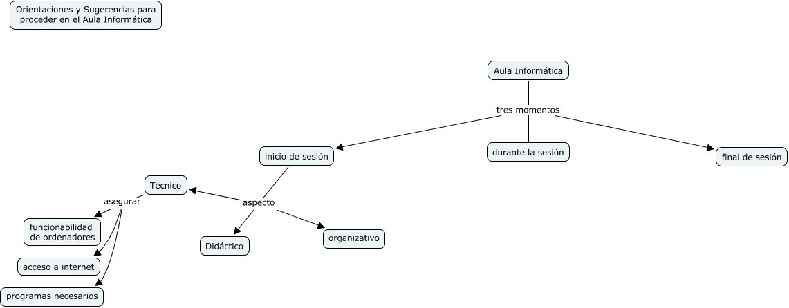 Este Cmap, tiene información relacionada con: Aula Informática, Técnico asegurar funcionabilidad de ordenadores, Técnico asegurar acceso a internet, Aula Informática tres momentos durante la sesión, inicio de sesión aspecto Técnico, inicio de sesión aspecto organizativo, Técnico asegurar programas necesarios, Aula Informática tres momentos inicio de sesión, Aula Informática tres momentos final de sesión, inicio de sesión aspecto Didáctico